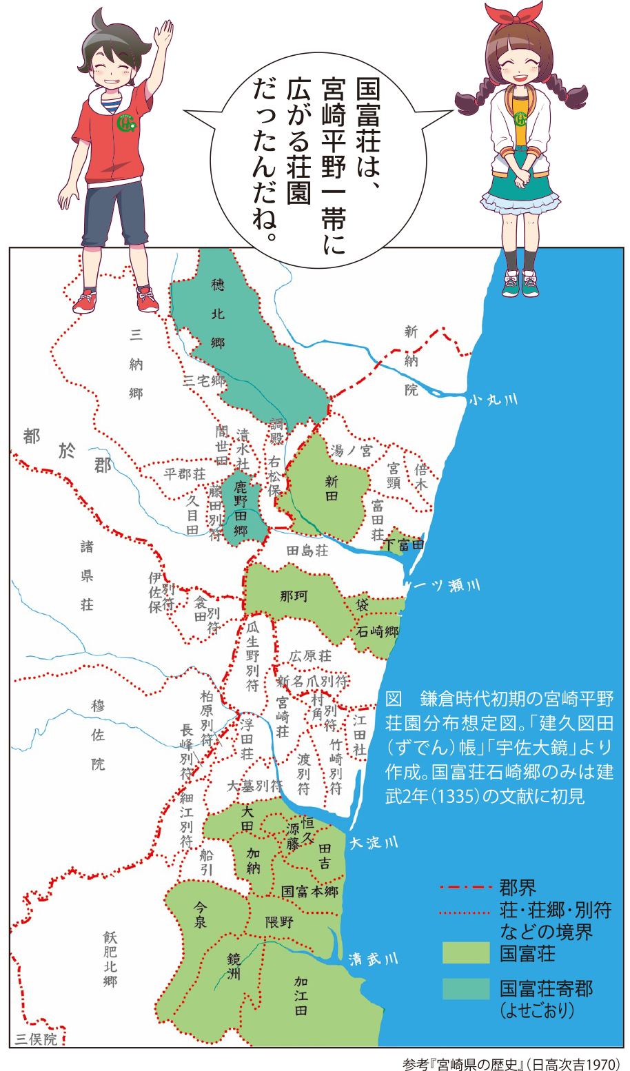 国富荘は、宮崎平野一帯を占めた1502町(ヘクタール)の広大な荘園で、八条女院(はちじょうにょいん)の御領でした。元弘(げんこう)3年(1333)には、後醍醐(ごだいご)天皇が、室町幕府初代将軍の足利尊氏に与えていますが、その後天龍寺領となり、さらに天授年間(1375〜1381)に伊東と土持の両氏に与えられました。