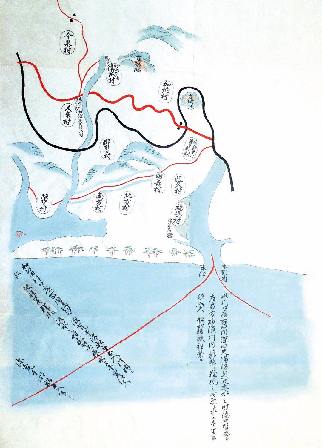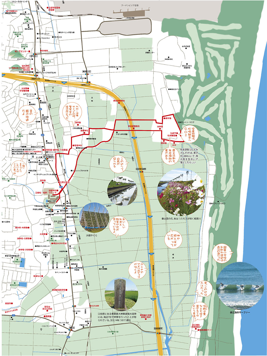 江戸時代後期の地図には「北方村」や「郡司分村」の名が見えます。南方村・熊野村東の入江は、1662年の外所(とんどころ)地震によってできました。