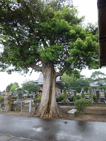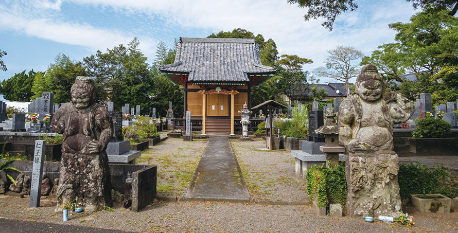 松崎観音に立つ2体の仁王像は、清武郷の禅宗僧侶平賀快然の作です。写真右奥には、日向七堂伽藍(ひゅうがしちどうがらん)のひとつである松崎寺があります。松崎寺の本尊は釈迦如来(しゃかにょらい)・観世音菩薩。
